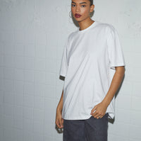 T-shirten er lavet i blød bomuld med en klassisk rund hals og et loose fit, der giver et afslappet udtryk. Det diskrete look foran brydes af et markant logo på ryggen.