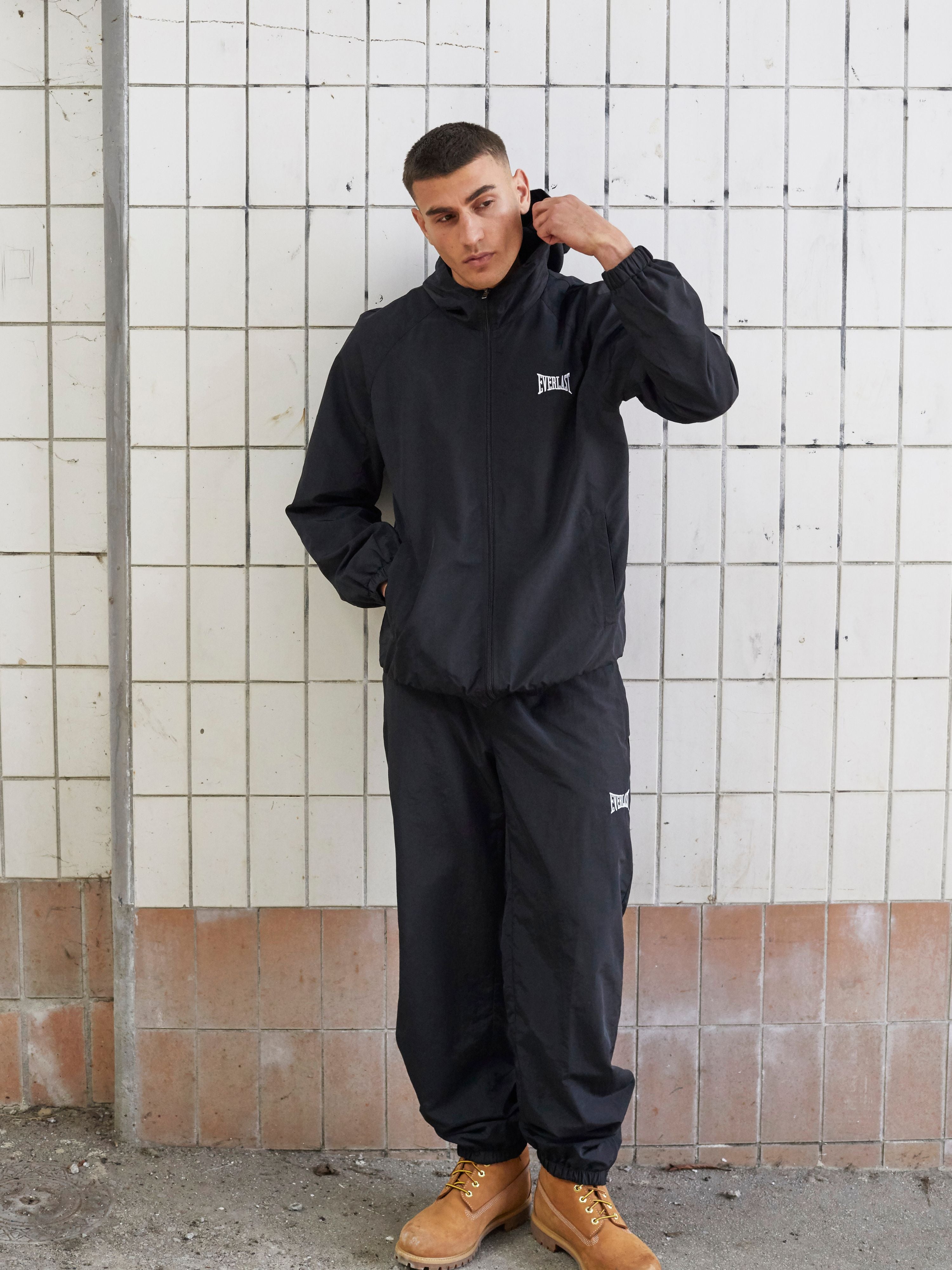 Fire billeder af modeller iført Everlast tracksuits og træningssæt i forskellige farver og designs – fra ensfarvet navy og sort til camouflage og gråtoner, fotograferet i urbane miljøer.