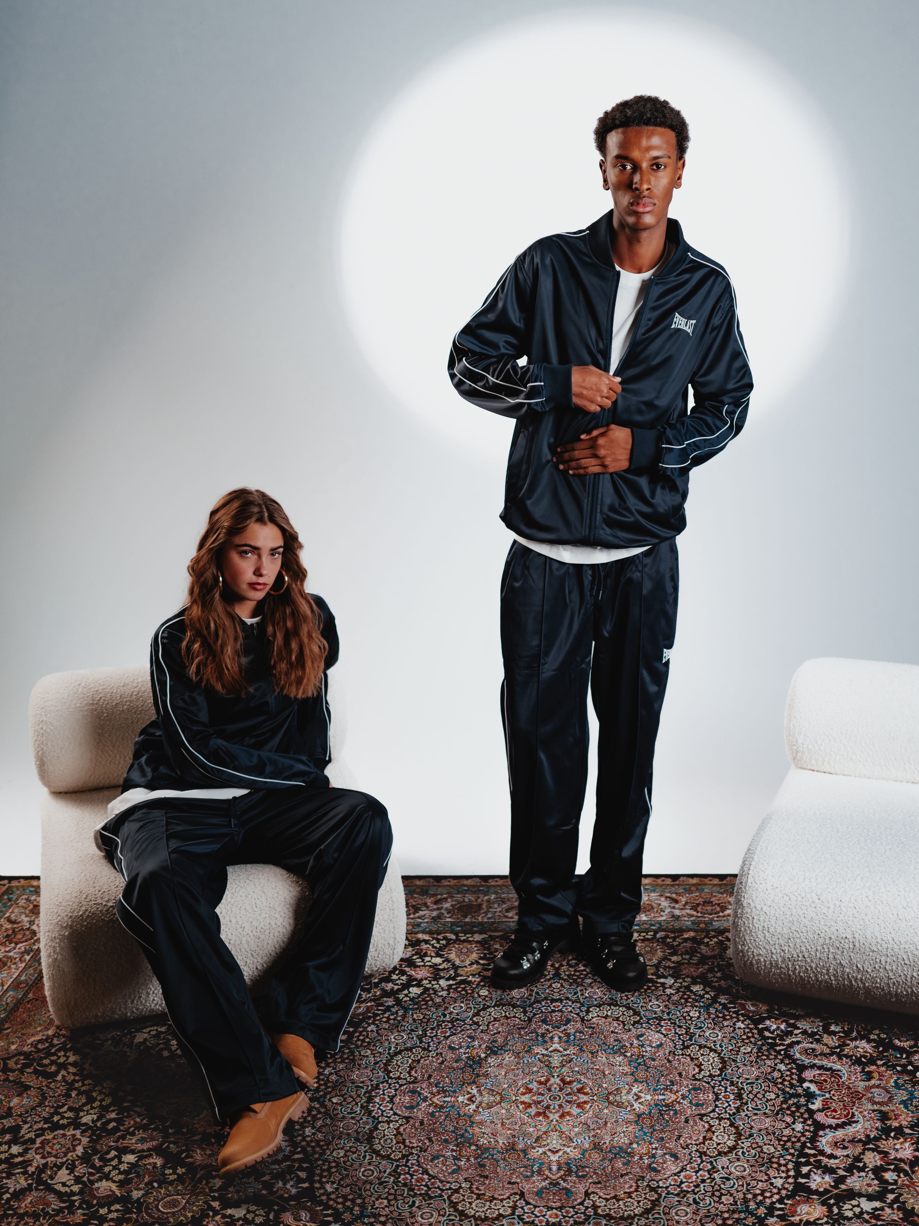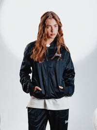 The jacket is made of a light, smooth material with a classic collar, zipper and stripes along the sleeves. The shiny look and loose fit give a relaxed but complete style.