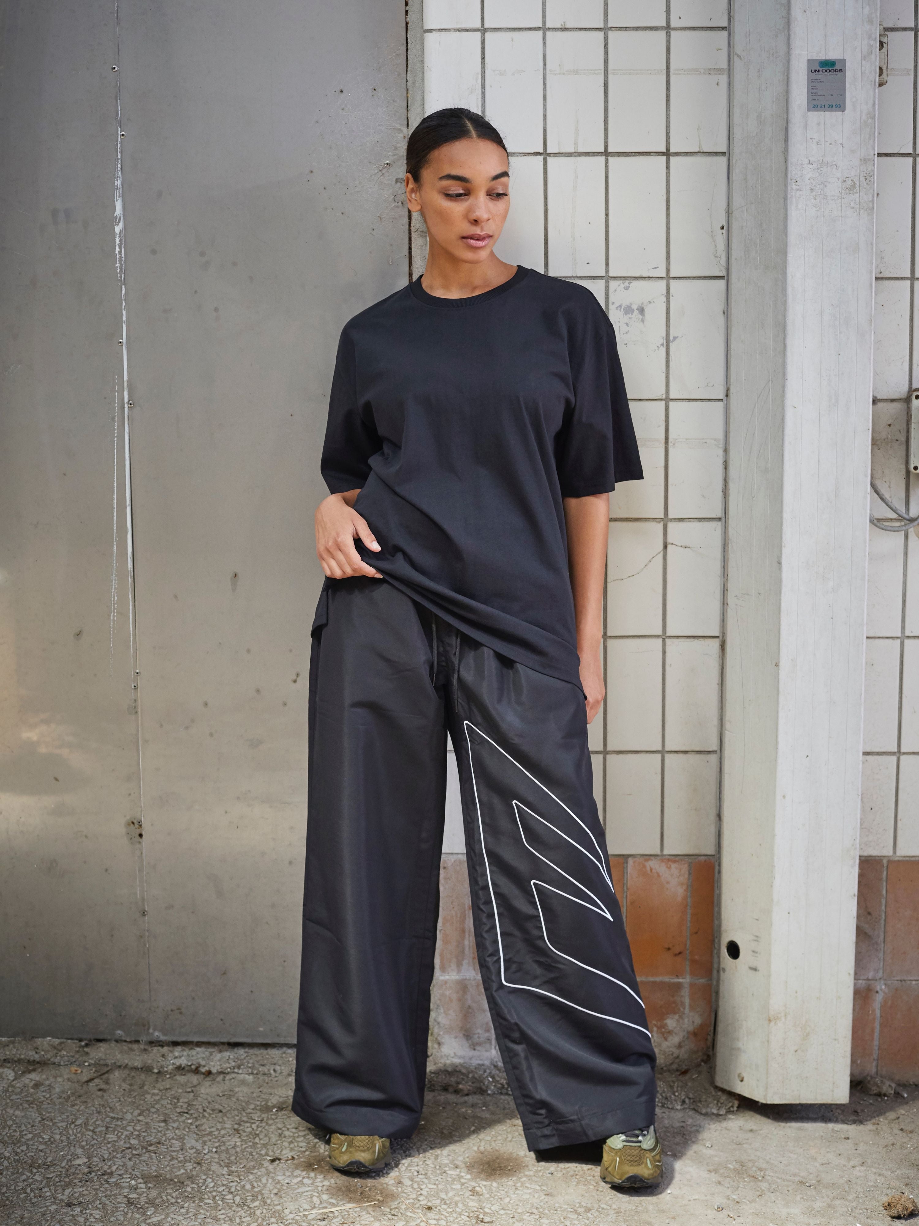 • Sporty track pants med et markant, grafisk udtryk. Bred pasform og let materiale giver et afslappet street-look med tydelige referencer til sport og bevægelse. Designet til både hverdagsbrug og off-duty styling.